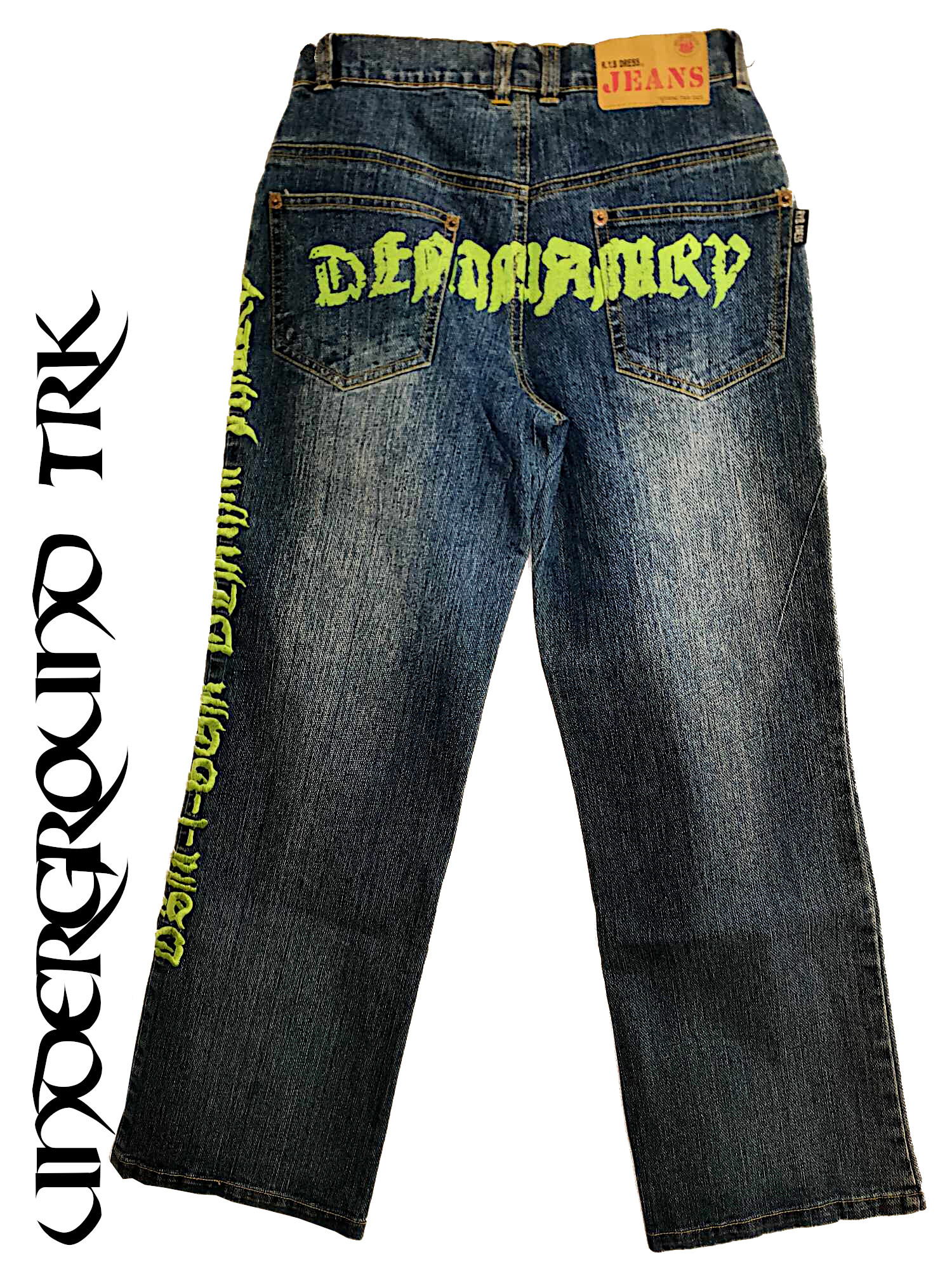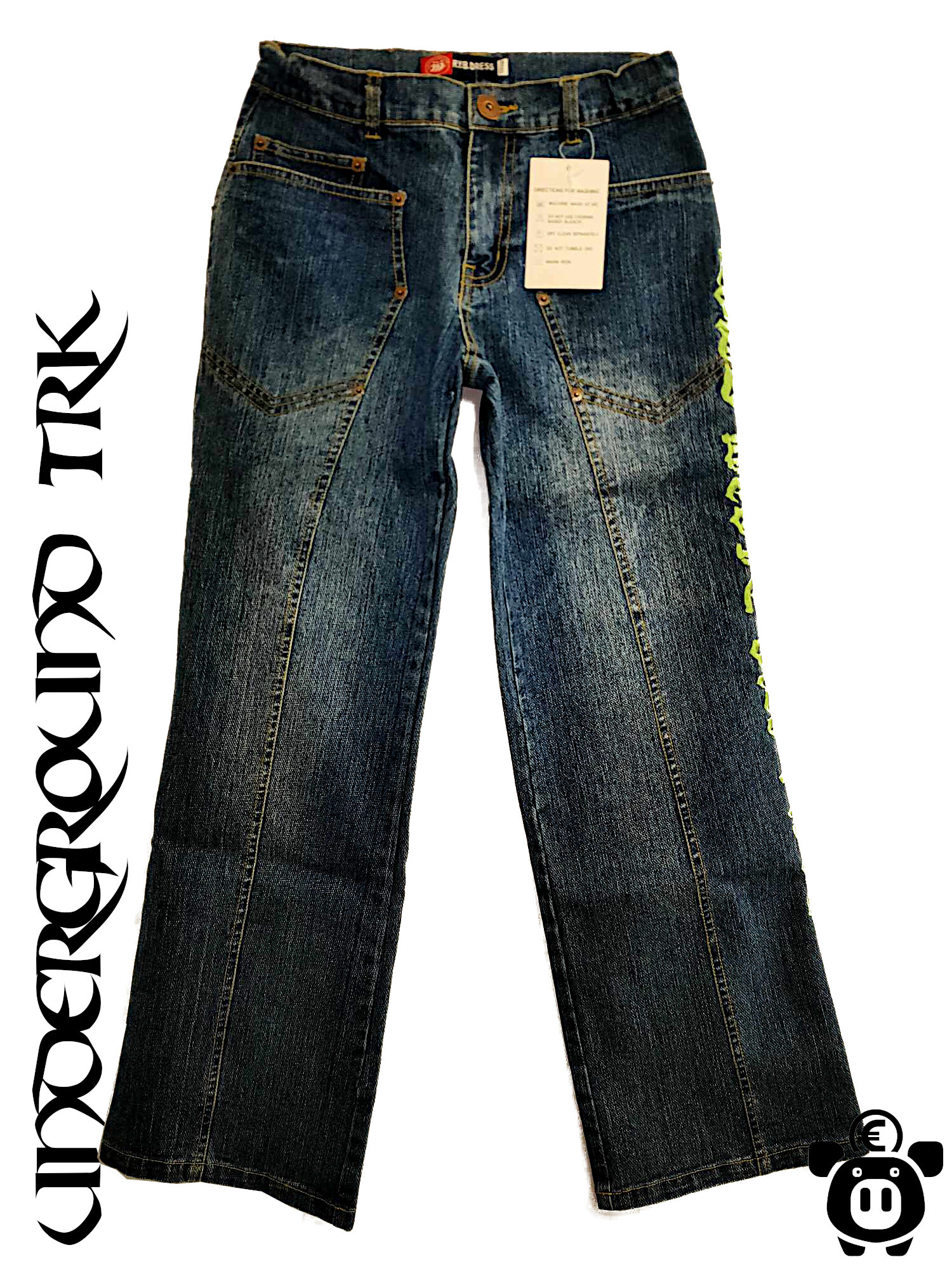 - Besonderheiten: Schriftablikation hinten, besondere Form der vordertaschen, Stickschrift linkes Bein seitlich